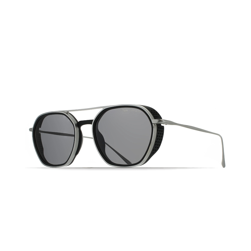 Óculos de sol em aço inoxidável com acetato, com lentes polarizadas, com hastes ultrafinas e flexíveis. Oferece uma sensação de leveza e ótimo conforto.