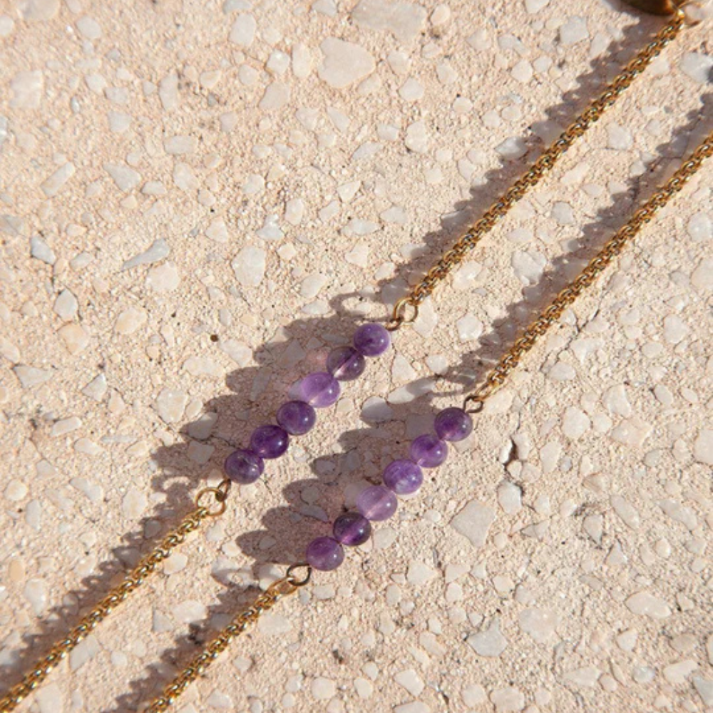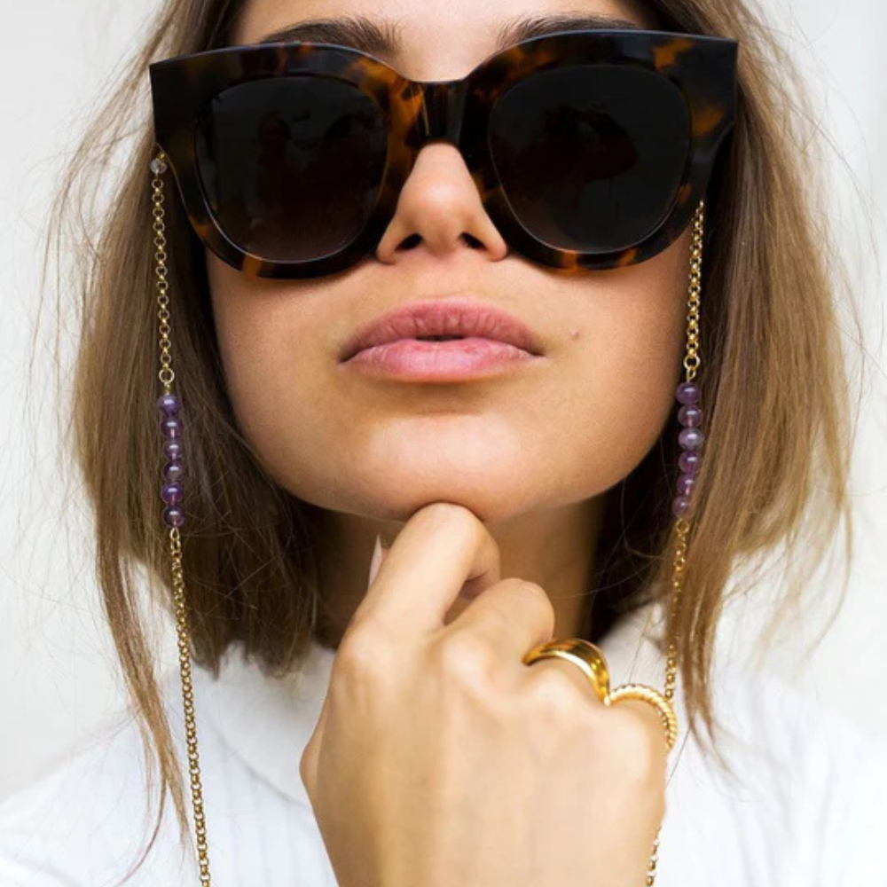 Cordão em aço inoxidável premium com revestimento, permitindo que seja leve para um uso confortável e maior proteção para cor e brilhos duradouros. É simples, mas se destaca pelas pedras preciosas roxas que pendem elegantemente no seu rosto.
